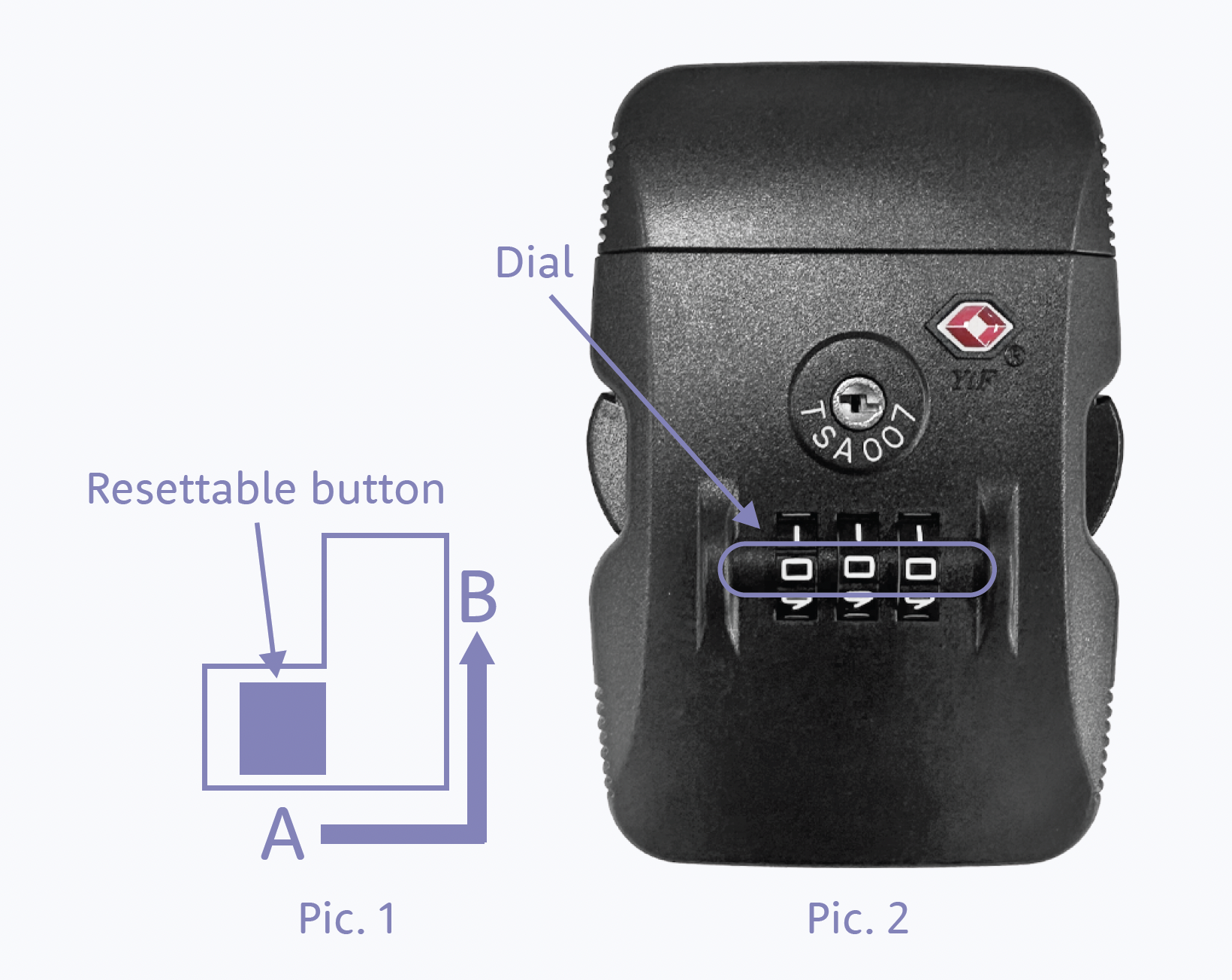 2. Push the resettable button (at the back) to B, (pic. 1). Set your own cipher by turning the dials.